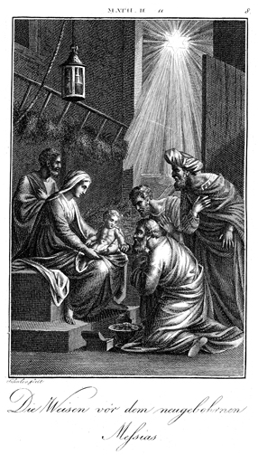 Description: The magi, or wise men, visit Jesus in Bethlehem bringing gifts of gold, frankincense, and myrrh. The star that guided them is visible in sky overhead. Mary holds the infant Jesus while Joseph looks on. The engraver, Carl Schuler (1785-1852), has placed his signature at the bottom left. As the numeral at the top right indicates, this is plate #8 in a series of illustrations.