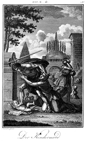 Description: Herod's soldiers murder all the male children two years of age and younger in the vicinity of Bethlehem. The engraver, Carl Schuler (1785-1852), has placed his signature at the bottom left. As the numeral at the top right indicates, this is plate #10 in a series of illustrations.