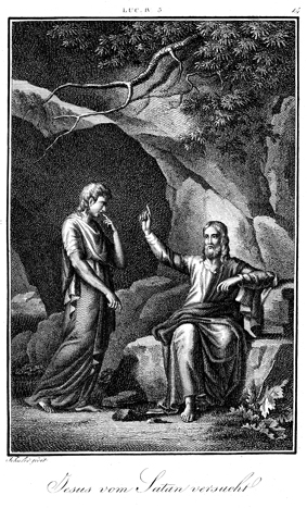 Description: Satan tempts Jesus in the wilderness. The engraver, Carl Schuler (1785-1852), has placed his signature at the bottom left. As the numeral at the top right indicates, this is plate #14 in a series of illustrations.