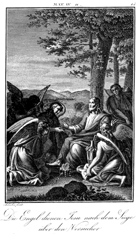 Description: After Satan's temptation of Jesus, the angels minister to Jesus The engraver, Carl Schuler (1785-1852), has placed his signature at the bottom left. As the numeral at the top right indicates, this is plate #15 in a series of illustrations.