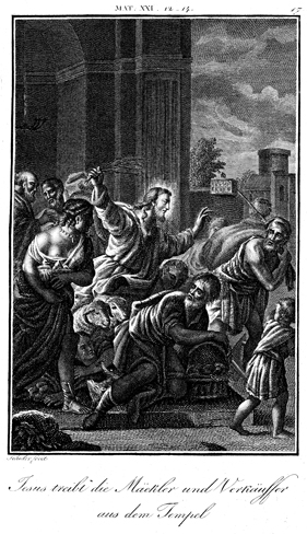 Description: Jesus cleanses the temple, driving out the animals and the moneychangers. The engraver, Carl Schuler (1785-1852), has placed his signature at the bottom left. As the numeral at the top right indicates, this is plate #17 in a series of illustrations.