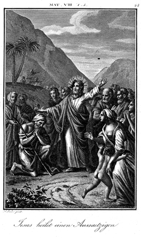Description: Jesus heals a leper, who kneels at his feet, in the presence of his disciples. The engraver, Carl Schuler (1785-1852), has placed his signature at the bottom left. As the numeral at the top right indicates, this is plate #23 in a series of illustrations.
