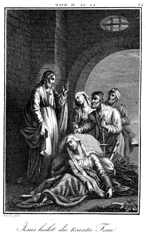 Description: A woman with an issue of blood touches the fringe of Jesus’ cloak and is healed. The engraver, Carl Schuler (1785-1852), has placed his signature at the bottom left. As the numeral at the top right indicates, this is plate #24 in a series of illustrations.