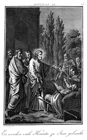 Description: As Jesus teaches throughout Galilee, he heals the ill and those possessed by evil spirits. The engraver, Carl Schuler (1785-1852), has placed his signature at the bottom left. As the numeral at the top right indicates, this is plate #25 in a series of illustrations.