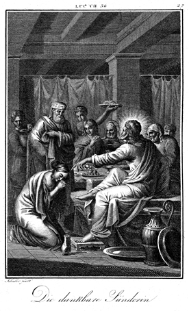 Description: This engraving depicts a sinful woman anointing Jesus with ointment from an alabaster jar and wiping his feet with her hair, as he eats in the house of Simon the Pharisee. The engraver, Carl Schuler (1785-1852), has placed his signature at the bottom left. As the numeral at the top right indicates, this is plate #27 in a series of illustrations.