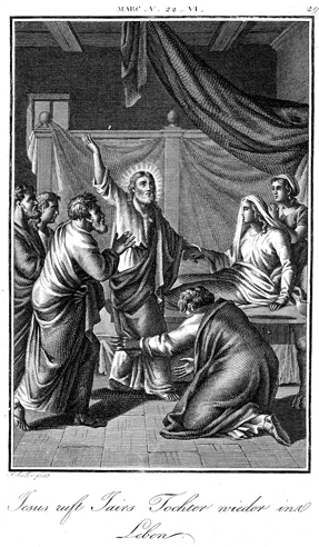Description: Jesus raises Jairus' daughter from the dead. The engraver, Carl Schuler (1785-1852), has placed his signature at the bottom left. As the numeral at the top right indicates, this is plate #29 in a series of illustrations.