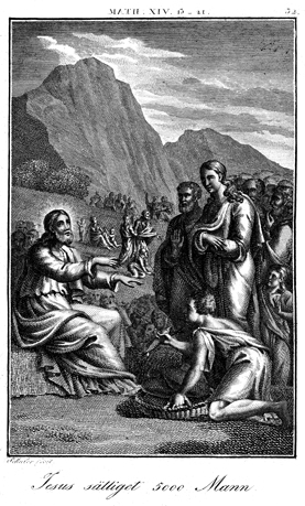Description: Jesus feeds the 5000 with five loaves of bread and two fish. The engraver, Carl Schuler (1785-1852), has placed his signature at the bottom left. As the numeral at the top right indicates, this is plate #32 in a series of illustrations.
