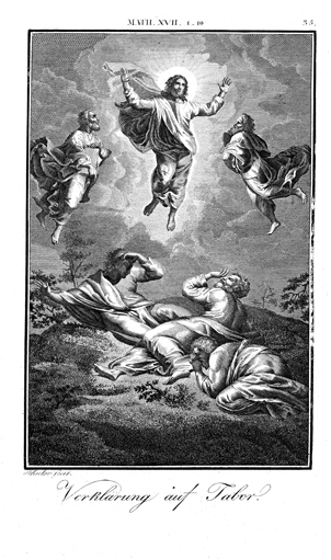 Description: The transfiguration of Jesus, with Elijah (left) and Moses (right) on either side of him and Peter, James, and John resting below. The engraver, Carl Schuler (1785-1852), has placed his signature at the bottom left. As the numeral at the top right indicates, this is plate #35 in a series of illustrations.