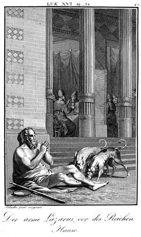 Description: Lazarus sits at the gate of the rich man, who lives in luxury. The engraver, Carl Schuler (1785-1852), has placed his signature at the bottom left. As the numeral at the top right indicates, this is plate #42 in a series of illustrations.