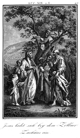 Description: Jesus speaks to Zacchaeus, who has climbed a sycamore tree in order to see him. The engraver, Carl Schuler (1785-1852), has placed his signature at the bottom left. As the numeral at the top right indicates, this is plate #48 in a series of illustrations.