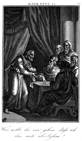 Description: Judas agrees to betray Jesus for thirty silver coins from the chief priests. The engraver, Carl Schuler (1785-1852), has placed his signature at the bottom left. As the numeral at the top right indicates, this is plate #53 in a series of illustrations.