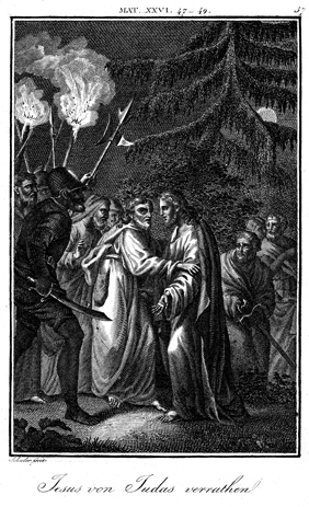 Description: Judas betrays Jesus with a kiss signaling Jesus’ identity to the guards who have come to arrest him. The engraver, Carl Schuler (1785-1852), has placed his signature at the bottom left. As the numeral at the top right indicates, this is plate #57 in a series of illustrations.