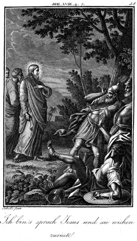 Description: Soldiers fall to the ground when Jesus identifies himself at his arrest. The engraver, Carl Schuler (1785-1852), has placed his signature at the bottom left. As the numeral at the top right indicates, this is plate #58 in a series of illustrations.