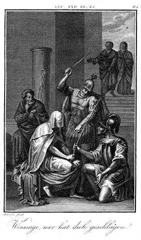Description: The soldiers clothe Jesus in a scarlet/purple robe, and hand him a reed for a scepter. They mock him, saying, “Hail, King of the Jews!” The engraver, Carl Schuler (1785-1852), has placed his signature at the bottom left. As the numeral at the top right indicates, this is plate #61 in a series of illustrations.
