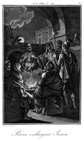 Description: In the courtyard of the high priest, Peter denies knowing Jesus. A rooster sits on top of the wall of the courtyard. The engraver, Carl Schuler (1785-1852), has placed his signature at the bottom left. As the numeral at the top right indicates, this is plate #62 in a series of illustrations.
