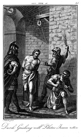 Description: On Pilate’s orders, soldiers flog Jesus. The engraver, Carl Schuler (1785-1852), has placed his signature at the bottom left. As the numeral at the top right indicates, this is plate #65 in a series of illustrations.