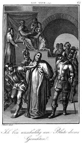 Description: Pilate washes his hands as Jesus is led away to be crucified. The engraver, Carl Schuler (1785-1852), has placed his signature at the bottom left. As the numeral at the top right indicates, this is plate #68 in a series of illustrations.
