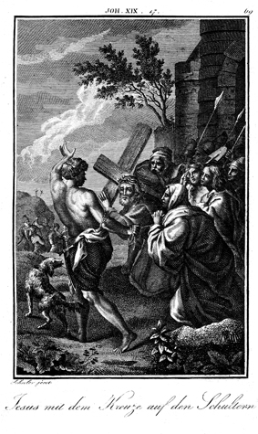 Description: Jesus carries his cross to Calvary. The engraver, Carl Schuler (1785-1852), has placed his signature at the bottom left. As the numeral at the top right indicates, this is plate #69 in a series of illustrations.