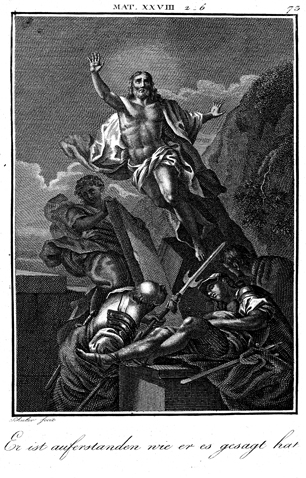 Description: An angel of the Lord rolls away the stone over Jesus' tomb. Jesus rises from the dead in the presence of soldiers, one of whom sleeps while the other watches in amazement. The engraver, Carl Schuler (1785-1852), has placed his signature at the bottom left. As the numeral at the top right indicates, this is plate #73 in a series of illustrations.