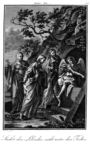 Description: An angel tells Mary Magdalene, Mary the mother of James and Salome that Jesus has risen from the dead. The engraver, Carl Schuler (1785-1852), has placed his signature at the bottom left. As the numeral at the top right indicates, this is plate #75 in a series of illustrations.