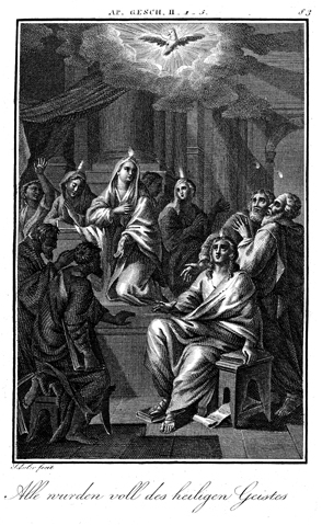 Description: The Holy Spirit descends on the disciples in the forms of a dove and tongues of fire at Pentecost. The engraver, Carl Schuler (1785-1852), has placed his signature at the bottom left. As the numeral at the top right indicates, this is plate #83 in a series of illustrations.