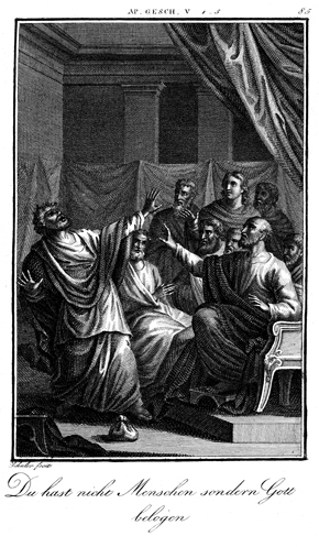 Description: Ananias dies after deceitfully attempting to hold money back from the community. The engraver, Carl Schuler (1785-1852), has placed his signature at the bottom left. As the numeral at the top right indicates, this is plate #85 in a series of illustrations.