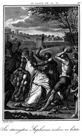Description: Stephen is stoned to death and thereby becomes the first Christian martyr. The engraver, Carl Schuler (1785-1852), has placed his signature at the bottom left. As the numeral at the top right indicates, this is plate #86 in a series of illustrations.