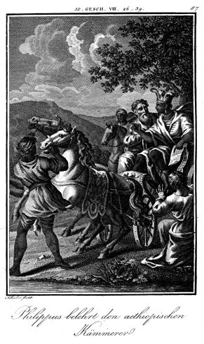 Description: Philip explains the gospel to the Ethiopian Eunuch, beginning with the servant song of Isaiah. The engraver, Carl Schuler (1785-1852), has placed his signature at the bottom left. As the numeral at the top right indicates, this is plate #87 in a series of illustrations.