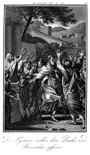 Description: Paul and Barnabas are mistaken for the Greek gods Zeus and Hermes in Lystra. The engraver, Carl Schuler (1785-1852), has placed his signature at the bottom left. As the numeral at the top right indicates, this is plate #92 in a series of illustrations.