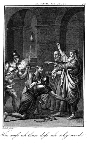 Description: The Apostle Paul and Silas were imprisoned at Philippi. When the Philippian jailor finds that they had not escaped, even after being freed by an earthquake, he asks them what he must do to be saved. The engraver, Carl Schuler (1785-1852), has placed his signature at the bottom left. As the numeral at the top right indicates, this is plate #93 in a series of illustrations.