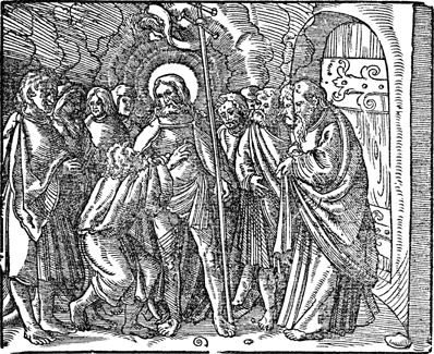 Description: Jesus appears to his disciples following his resurrection and instructs Thomas to touch his wounds.