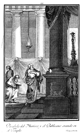 Description: A Pharisee and a tax collector pray in the temple. The engraver’s name is located at the lower right corner.