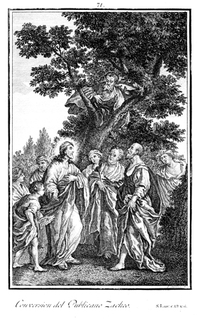 Description: Jesus speaks to Zacchaeus, who has climbed a sycamore tree in order to see him. The engraver’s name is located at the lower right corner.