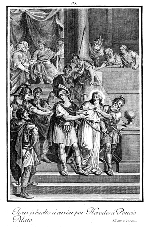 Description: Jesus is tried before Herod and then sent back to Pontius Pilate. The engraver’s name is located at the lower right corner.