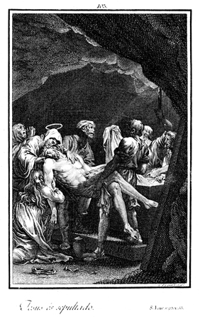 Description: Jesus is buried by Joseph of Arimathea and the women who followed Jesus from Galilee. The engraver’s name is located at the lower right corner.