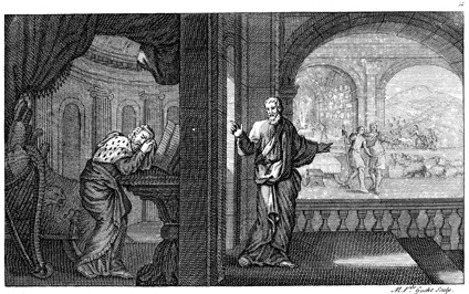 Description: David weeps upon hearing of his son Absalom’s death. The engraver, Michael van der Gucht (1660–1725), has placed his signature in the lower right.