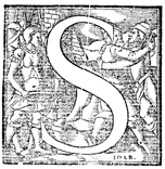 Description: An initial letter S featuring a soldier with bow and arrow and two men embracing.