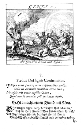 Description: As Noah and his family gather in worship after the flood, God, represented by the Tetragrammaton, places a rainbow in the sky as a sign of his pledge to never again destroy the earth by flood.