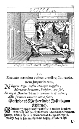 Description: Joseph flees Potiphar's wife, leaving his cloak in her hands.