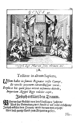 Description: Joseph stands at Pharaoh’s throne explaining to him that the seven fat and seven lean cows, and the seven good and seven lean stalks represent the seven years of feast and famine that are to come in Egypt.