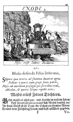 Description: Moses helps Reuel's daughters at the well of Midian.