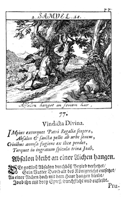 Description: While Absalom is defenseless, hanging by his head from a tree, Joab seizes the opportunity to slay him.