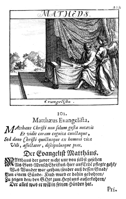 Description: Matthew writes his gospel with his attribute, the angel, nearby.