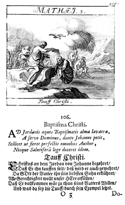 Description: Jesus is baptized by John the Baptist in the Jordan River. The Holy Spirit appears overhead in the form of a dove along with God the Father.