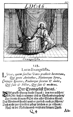 Description: Luke writes his gospel with his attribute, the bull, nearby.