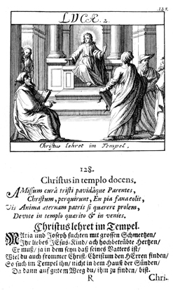 Description: Mary and Joseph find the twelve-year-old Jesus in the temple, sitting among the teachers, listening and asking questions.