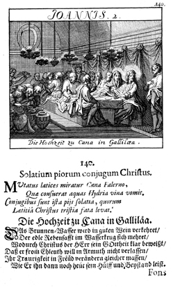 Description: While Jesus and his mother are at a wedding in Cana, Jesus turns water into wine after the original supply of wine is exhausted.