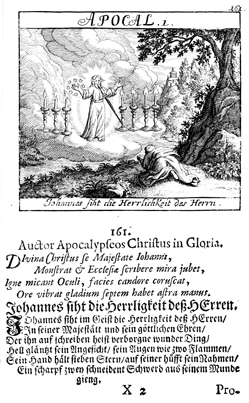 Description: John's vision of the one like the son of man among the seven golden lampstands. John is pictured bowing at his feet.