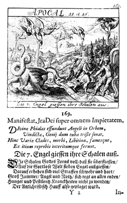 Description: The seven bowls of God's wrath are poured out upon the earth, as the dragon breathes evil spirits, depicted as frogs.