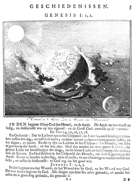 Description: The earth floats between the clouds and is irradiated from the left by the sun and from the right by the moon and the stars. The Dutch artist and poet Johannes Luyken (1649-1712) drew and etched this emblem and wrote the accompanying poem.